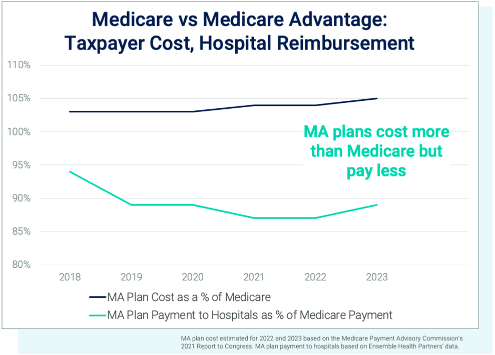 In addition to costing taxpayers more, MA plans are paying hospitals less than traditional Medicare. Instead of paying 102 percent or more as outlined in their contracts, MA plans are actually paying less than 90% of Medicare rates to the organizations delivering care to their patients.